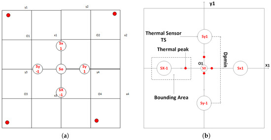 The two cases are when the temperature of a sensor is the highest compared to the temperatures of the other sensors , , , , and in the second case, the temperature read on is lower than the temperature of other sensors. When is greater, the likelihood of a thermal peak in this zone is very high. Thus, in this case, it is assumed that the thermal peak is inside the bounding area, bounded by , , , . In Figure 6a. We illustrate the principle of the first case. The bounding area that supposedly has a thermal peak is colored in red, and the remaining zone is assumed not to contain the hottest point and is colored in blue.