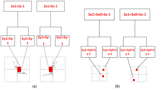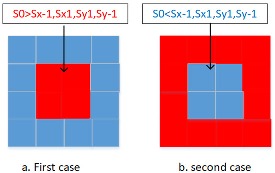 The second case is illustrated in Figure 6b. The blue area represents the area deemed unnecessary to scan for hot spot detection; however, the red area must be thermally scanned. The red zone shown in Figure 6b includes the following possibilities: > > , < < , < < , and finally > > .