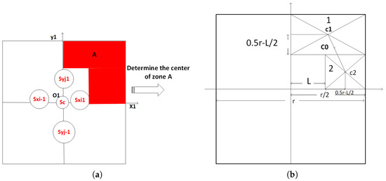 Figure 8b shows the center of the zone A. Area A consists of the two rectangles 1 and 2 as shown in Figure 8b, and it is L-shaped. Let and be the center and the area of rectangle 1, respectively, and and the center of rectangle 2, respectively. The center of zone A is therefore the barycenter of (, ) (, ), which is located between C1 and C2 and that verifies Equation (7):