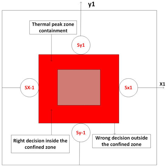 Assume that the area A colored in red shown in Figure 8a is selected for the next thermal scan, i.e., > > , and > > . The next step is to find the middle of this zone, and the goal of taking the thermal measurements in the middle of zone A is to decrease the number of sensors needed to find the thermal peaks. In other words, we only scan areas that potentially contain a thermal peak to facilitate thermal peak point identification.
