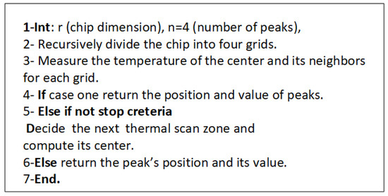 The pseudo-code of the thermal zone detection algorithm is given in Figure 10. This algorithm does not determine the real location of thermal peaks and their temperatures; it only tracks the thermal gradient and gives the highest temperature points close to the heat sources. This can lead to significant errors. In fact, it is not easy to optimize the distance between the location of the sensors and the thermal peak [15].