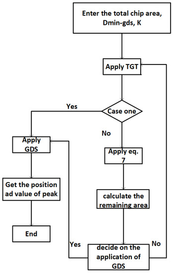 The flow diagram of the combined TGT-GDS algorithm is shown in Figure 12. The first and second cases correspond to the TGT algorithm. In the first case, the peak is inside the bounding area. In the second case, the peak is outside the bounding area. Thus, recursive scanning from the center is continued until we obtain an area and a temperature, estimated by Equation (7), suitable for applying the GDS technique. is the parameter that determines the minimum distance that GDS can cover.