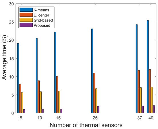 Figure 13 shows the average run time of these methods for various numbers of thermal sensors . It is clear that the K-means, energy center, and grid-based methods require a longer run time, and this becomes even longer as the number of thermal sensors grows. Note that K-means is considerably more worse than the others. Note also that the proposed algorithm requires a short time to identify the most significant sensors and that the run time only increases slowly with the number of thermal sensors used. Compared with the grid-based method, the proposed method can significantly reduce the run time by up to 78 percent, which helps to further mitigate the threat of thermal peak evolution. The amount of time required to allocate sensors is crucial and depends on the requirements of dynamic thermal management systems, and for high performance [21,40,41], the amount of time is generally in order of hundreds of milliseconds. Therefore, the proposed algorithms ensure the efficiency of peak detection.