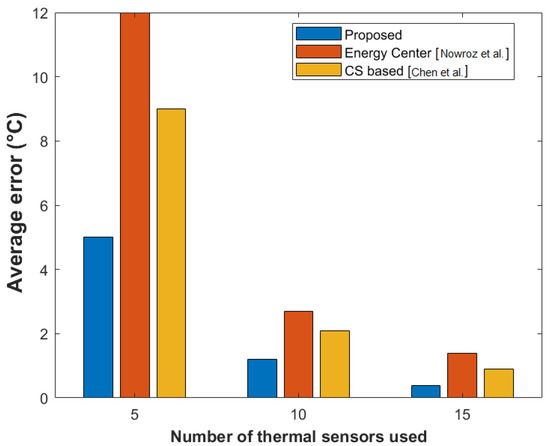 The CS-based method [42] and energy clustering method [24] both use the frequency characterization of the heat distribution as an index to allocate the thermal sensors. The spectral representation is a non-limited band, and filtering can lead to a lack of necessary information, which in turn results in an overestimation of temperature. Unlike these two methods, our proposed hybrid method, TGT-based GDS, intelligently scans for potential thermal spike locations and automatically adjusts the parameters to find the best position of the thermal sensors for better estimation of spike value and placement, which can reduce the number of sensors needed for better estimation, as noted in Figure 14.