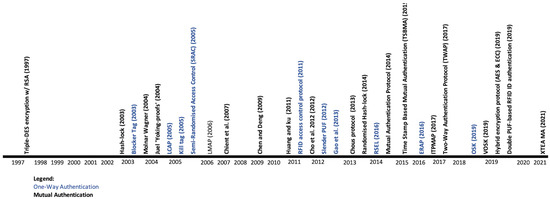 The authors of the authentication protocols reviewed in Section 4 used a number of approaches to address security risks associated with passive RFID technology with a common goal of improving the overall performance and security risks associated. Out of the 29 protocols evaluated, only the ITPMAP [64] protocol claims to be able to defend against all known attacks. Given the limitations of the technology, all researchers were faced with similar challenges. Whilst the protocols improved periodically, the majority of the protocols are still susceptible to a number of attacks. A timeline of the protocols evaluated is shown in Figure 2. Given the security risks and issues presented, further work is required to address these shortfalls.
