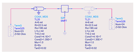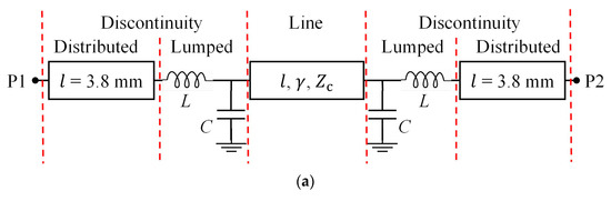 In order to account for the launch transition, a model was derived considering it as a distributed coaxial line, derived using ADS. This model is shown in Figure 8, and a comparison of this model with experimental data is shown in Figure 9. The good agreement of the model with the experimental data indicates that the distributed representation of the coaxial connectors allows the reflection effects to be characterized in relatively large transitions. As can be seen in Figure 9, using a lumped LC model for the coaxial connectors produces good results up to 10 GHz, but for higher frequencies, the representation is not good enough. The lumped model represents the termination only as a reflective structure; therefore, using this approximation, the impedance of the connector might be acceptably represented, but it is assumed that no standing waves would occur within the connectors themselves. Nonetheless, as frequency increases, the wavelength of the propagating signals is reduced and may become comparable with the physical length of the connectors. In this case, the LC circuit does not capture the distributed effect of the connectors, and therefore, the model fails to represent the multi-transmission line structure composed by the microstrip lines embedded between coaxial connectors that in reality behave as coaxial transmission lines at high frequencies.