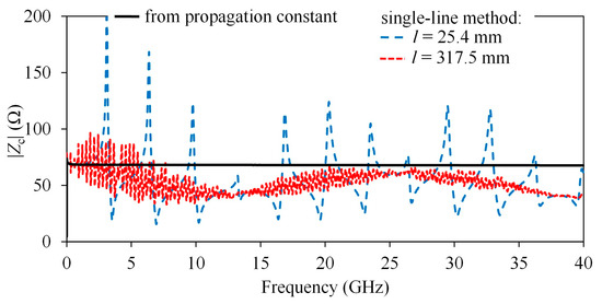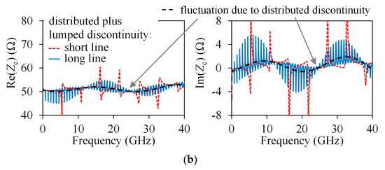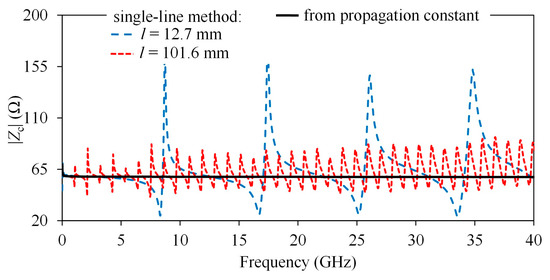 On PCB lines, the PUL resistance is considerably smaller, but the associated length might be so large that a significant number of fluctuations on Zc can be observed within a range of a few tens of gigahertz. In Figure 5, Zc extracted using (2) is shown for two lines of different length, as well as that extracted from γ [13]. As can be seen, the fluctuations due to reflections within the line length have a greater magnitude for the shorter line but occur at a higher rate on the longer line. Observe in Figure 5 that, in reference to Figure 1b, the form of the curves evidences a dominant inductive effect associated with the transition. In contrast, Zc obtained from γ is smooth, so it can be taken as a good approximation for lines with these characteristics. The disadvantage of this procedure is that it requires previous knowledge of the frequency-dependent complex permittivity. Otherwise, a constant effective permittivity and loss tangent can be assumed, but causality in the representation of the line might be compromised.