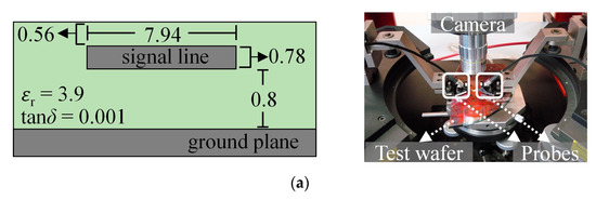 Microstrip lines with the cross section and dimensions shown in Figure 3b were formed on a PCB laminate with nominal permittivity and loss tangent of 2.2 and 0.0019, respectively [16]. The lengths of the lines are l = 12.7 mm and 101.6 mm, and present a design Zc 51 Ω. The measurements were performed using GSG probes with a 150 µm pitch.