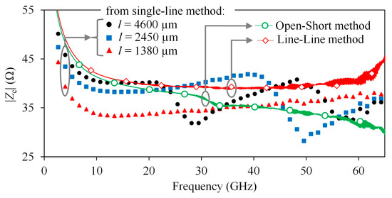 For microstrip lines manufactured on PCB, it is expected that the |Zc| curve does not vary considerably with frequency since the losses are relatively small. Conversely, for microstrip lines made on silicon, the films of the signal traces are thin enough to have per unit length (PUL) resistances of the order of kΩ/m. This high resistance causes the characteristic impedance to have a strong variation over a wide range of frequencies [20]. For the on-chip lines, the Zc obtained using (2) for the different line lengths is shown in Figure 4. In addition to the fluctuations due to the transitions, Zc exhibits large discrepancies depending on the line length, which is unexpected. On the other hand, using the open-short method [21], the fluctuations due to discontinuities are smoothed; however, an unexpected roll-down of the Zc is noticeable as frequency increases. This variation is originated because the open and short structures consider that the transition between the pads and the lines is abrupt. In contrast, using the line–line method [11], a flat Zc is achieved from 10 to 50 GHz, which can be considered closer to the expected value. In this latter case, the extraction method relies on the fact that the transition can be represented by means of a lumped shunt admittance, which is valid provided that the pad array can be considered relatively small, a condition fulfilled for on-chip interconnects but not for PCB lines.
