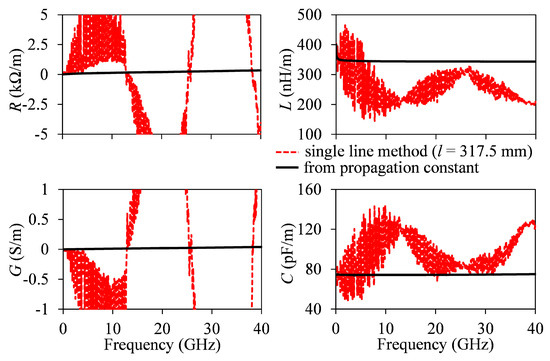 The mentioned fluctuations are transferred to the RLGC parameters shown in Figure 7. Here, the lines labeled “from propagation constant” refer to (2) considering constant values for permittivity and loss tangent, which are not true in practice. Observe that the fluctuations are so large that the expected frequency variation of the curves, predicted by the data obtained when Zc is obtained from γ, is barely noticeable.