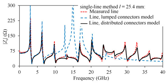 For the third case, the PCB lines terminated with coaxial connectors exhibit an additional effect that considerably complicates the extraction of Zc from measured S-parameters. Due to the electrical length of the coaxial-to-microstrip transitions, a distributed model for the discontinuity needs to be considered, so the interconnect plus the transitions needs to be modeled with (4). In Figure 6, Zc obtained using (2) as well as from γ is shown. Unlike the case where probes were used to measure, fluctuations not only occur with a periodicity related to the length of the lines, but Zc presents an additional fluctuation of lower periodicity, which is related to reflections along the length of the coaxial connectors. Although these reflections are present in any type of discontinuity, they become more noticeable in this case for the considered frequency ranges. Therefore, when the length of the transition is considerably long, it makes it even more difficult to determine the actual frequency dependence of Zc from experimental data. Interestingly, when comparing the curves in Figure 6 with the conceptual plots in Figure 1b, it can be observed that at frequencies below 15 GHz, the transition exhibits a dominant capacitive behavior, which becomes inductive at higher frequencies. This is indicative of the importance of implementing a broadband model for this type of microwave transition measurement.