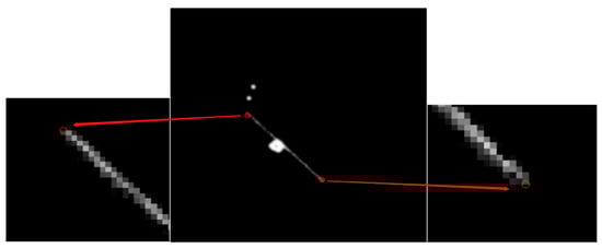 For striped targets, the gray gradient changes little when following the target stripe direction, and the gradient changes rapidly in both horizontal and vertical directions at the endpoint position, and there is a significant change in the grayscale within the window, indicating the presence of corner points. Therefore, this method can be used to locate the endpoints of striped targets. The two endpoints of the localized space target image are shown in Figure 2.