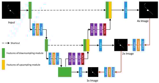 In this paper, the design of the super-resolution network is constructed based on the U-Net network [], and the network structure is shown in Figure 3, which mainly contains two parts: the primal regression network and the dual regression network. The part indicated by the black arrow in the model is the primal network of the model, while the part indicated by the red arrow corresponds to the dual regression network.