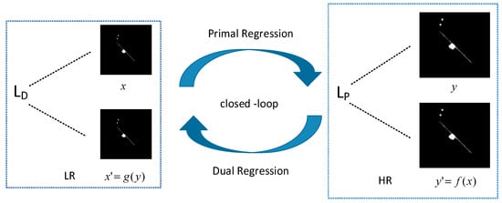 The loss function has two main components: the loss of the primal regression network and the loss of the dual regression network. Given a set of N pairs of samples , denotes the ith pair of LR and HR images in this set of paired data. The training loss is shown in Equation (13):