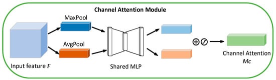 The channel attention structure is shown in Figure 5, where the image is channel dimension-weighted and first undergoes the maximum pooling and average pooling operations based on and to obtain two outputs, which are then fed into the shared connection layer and processed separately to obtain two feature maps according to the activation function, followed by the sum operation and multiplication operation with to obtain the channel attention feature . The whole process of channel attention operation can be expressed as