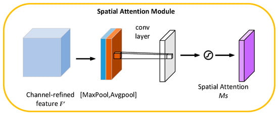 The structure of the spatial attention mechanism is shown in Figure 6. is the input image of the spatial attention module, and the size remains . First, the two outputs were obtained by carrying out two pooling operations based on the channels, and then downscaling them into one output, and after activation processing, the output feature and the input feature map were multiplied to obtain the final weighted features for learning. The whole operation process of spatial attention can be expressed as follows: