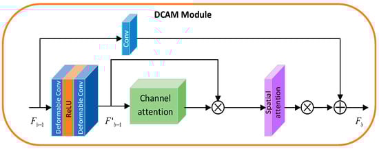 As the number of network layers deepens, the network can perform more complex feature extraction, but at the same time, the model is prone to overfitting and gradient disappearance and explosion, etc. The introduction of the residual learning [] network structure to learn the feature mapping was simpler than that of the deep network model, which greatly improved the performance of the deep network model. In this paper, the Deformable Convolutional Attention Module (DCAM) was constructed based on the residual module used in the RCAN [] model, which fuses the channel attention mechanism and the spatial attention mechanism and uses deformable convolution instead of normal convolution to effectively extract the high-frequency information in the feature images. The structure diagram of the improved Deformable Convolutional Attention Module (DCAM) is shown in Figure 7.