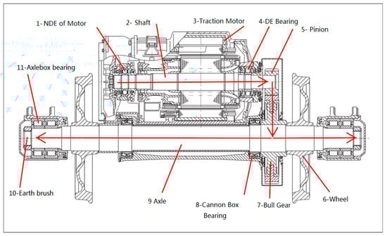 In Figure 1, motor (3) is an inverter-fed AC asynchronous traction motor with a power rating of 1600 kW. The NDE (non-drive end) of the traction motor is mounted with axle (9) through the cannon box and bearing (8); the pinion (5) fitted on the motor shaft is coupled with the bull gear (7) press fitted on the axle (9). Both ends of axle (9) are fitted with bearings (11) seated in the journal box, which is mounted with the earth device (10). When the motor is fed by the IGBT inverter, the generated bearing current will flow through pinion gear (5) on the motor shaft (2) to the bull gear (7) on the axle (9), along the axle (9) and cannon box bearing (8) to the end of the axle, and finally flow through the earth brush (10) to the ground, as the red arrow line shows in Figure 1. The motor bearings, the bearings in the cannon box, and the journal box are on the current path and exposed to the electric current produced by the motor, which implies that there is a potential risk of electric erosion. So, it is a must to classify the current paths of the AC drive system of the EMU and locomotive from a systematical point of view in order to find reasonable measures to eliminate or reduce them to a safe level.
