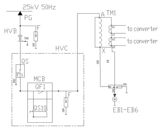 The first current path is the primary current earthing path, as illustrated in Figure 2. The single-phase alternate current with a voltage of 25 kV runs through the pantograph (PG), then flows through the high voltage bushing (HVB), the high voltage isolating switch (QS), and the main circuit breaker (MCB) to the terminal A of the primary side of the main transformer TM1. After passing the primary winding of the main transformer at terminal X, it is grounded by earth brushes (EB1–EB6) mounted on the axle end, then it returns to the rail through wheels and flows back to the substation.