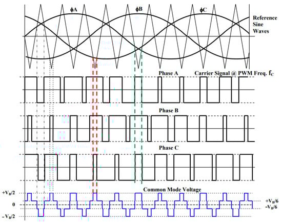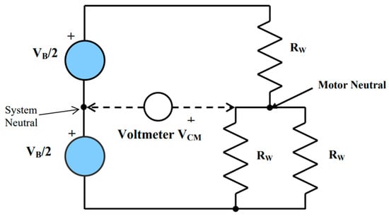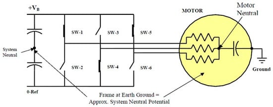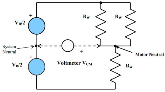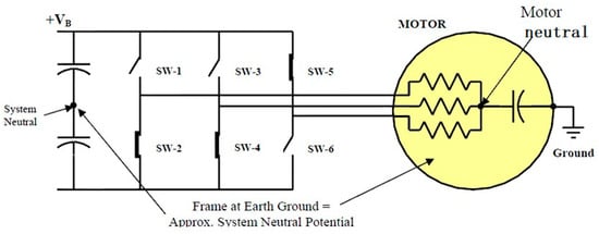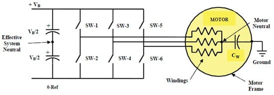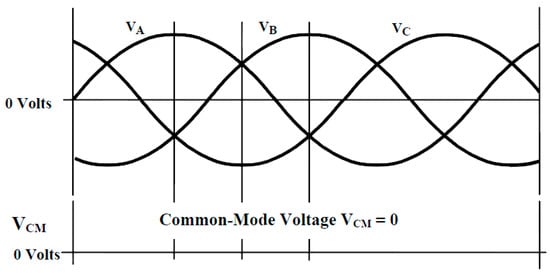 As illustrated in Figure 6, for the three-phase balanced sine wave power supply case, the common mode voltage equals zero (VCM = 0). In the inverter supply case, the common mode voltage depends on the inverter switching state and will no longer be zero but change with the inverter switching state [].