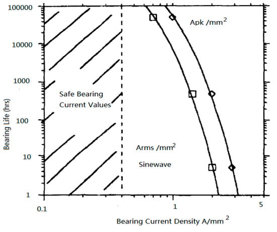 The relationship between the bearing life and the current density is illustrated in Figure 13 []. On the contact surface, according to the Hertz contact theory [,], if the bearing runs for enough time until the bearing is electrically eroded, the current density threshold value on the contact surface is 0.7 (Apk/mm2). Studies have shown that if the bearing current density is less than 0.4 (Apk/mm2), it will not affect the mechanical life of the bearing.
