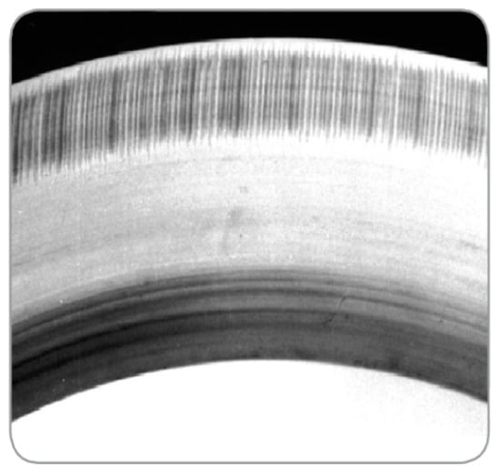 Electric corrosion can lead to bearing damage and even permanent failure. The first stage of the damage is microcraters, which are invisible to the naked eye and are caused by the EDM current. The phenomenon of microcraters is similar to spot welding appearing on the race surface of the bearing, as shown in Figure 14 and Figure 15, with a diameter of only a few microns. The second stage of damage is associated with microcraters, often referred to as washboard pattern damage, as shown in Figure 16. The principle of the formation of the washboard is still unclear.