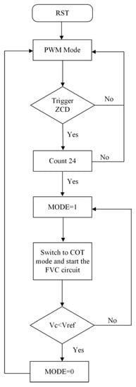 The MODE signal is fed into the Buck circuit and connected to the selection control S of a MUX dual selector, which selects the duty ratio signal. When MODE = 1, select the duty ratio signal generated by COT mode; when MODE = 0, select the duty ratio signal generated by PWM mode, so as to complete the automatic switching of the control mode. The above process is summarized in a flow chart shown in Figure 6.