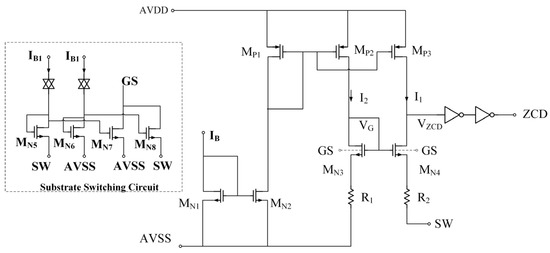 Therefore, a simple zero-crossing detection circuit is designed in this paper that adopts the common gate current comparator structure and uses the substrate replacement circuit to improve the sensitivity of the zero-crossing detection circuit and speed up the turn-off process of the power switch. The structure of the circuit is shown in Figure 7.