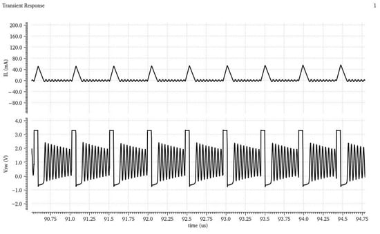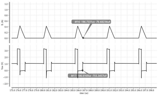 The simulation results are shown in Figure 10. It can be seen that the ringing phenomenon disappears. The flip point of zero-crossing detection is −755 uV, and the inductor current is −76 uA. The zero-crossing detection circuit works normally, and the results meet the design expectations.