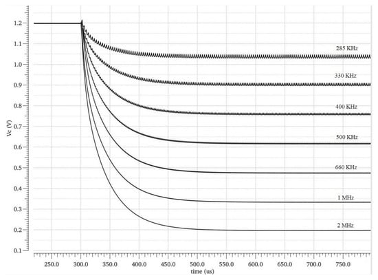 The simulation results of the frequency and voltage conversion circuit are shown in Figure 11. Depending on the different frequency of HS, from 285 kHz to 2 MHz, the FVC circuit will generate different voltage values. From this, we establish a relationship between the frequency and voltage, and the frequency is related to the load current. Finally, the relationship between the load current and the voltage can be obtained. Based on this correspondence, the mode-switching circuit can automatically complete the mode-switching process according to the load current, as shown in Figure 12. The transfer point can also be adjusted by setting the reference voltage of the comparator in the FVC circuit. Vref is set to 0.6 V.