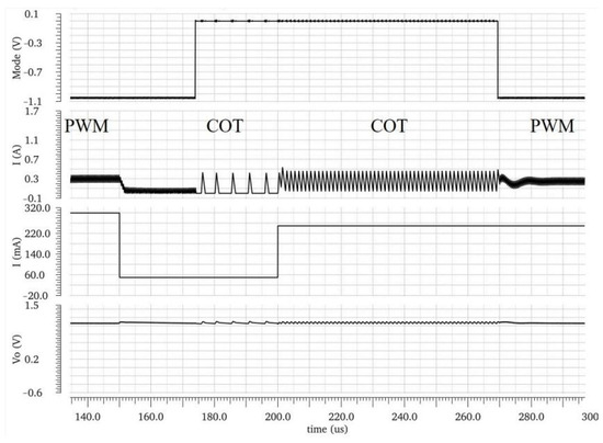 A simulation of the automatic mode-switching process of the converter in normal operation according to the load conditions is shown in Figure 13. The load current is dynamically switched from 300 mA to 50 mA and then back to 300 mA. The mode signal shows a low level in PWM mode. When the load current is reduced to 50 mA, after a certain period of time, the converter automatically switches to COT mode. At this time, the mode signal is high, and the switching frequency of the converter working in COT mode has obviously changed. After that, the load jumps to 300 mA. At this time, the converter is still working in COT Mode. However, after a certain amount of time, the converter switches to PWM mode. It is shown that the mode signal is on a low level, and the switching frequency of the converter also becomes higher. According to the simulation results, the converter conforms to the design scheme described in Section 3.2.