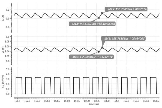 The converter is simulated under the max load current in PWM mode, as shown in Figure 14. The input decoupling capacitance is 4.7 uF, and the output capacitance is 10 uF. The inductor is 2.2 uH, and here, we assume ESR = 100 mΩ and DCR = 60 mΩ. The input voltage is 3.3 V. The output port is mounted with 1.05 Ω. As shown in Figure 14, the converter works stably at IO = 1 A, and the average output voltage is 1.048 V. The voltage ripple is 17.3 mV, the inductor current ripple is 171.8 mA, and the switching period is 490 ns.