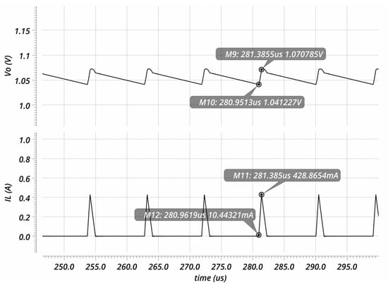 The converter is in COT mode, which is under the condition of a light load, as shown in Figure 15. The simulation conditions are as in the previous section, and the control system automatically switches to the COT mode when the converter is working under a light load. The resistance mounted on the output becomes 35 Ω. As can be seen is Figure 15, when the converter works stably, it works in DCM mode. The output voltage is 1.05 V, and the voltage ripple is 30 mV, which is larger than the voltage ripple in PWM mode. The constant on time is 434 ns. In addition, the switching period is about 9 us, which is much larger than the PWM’s switching cycle. The switching loss can be reduced by lowering the frequency, but the cost of this is that the ripple of the output voltage becomes larger, and the band of the switching frequency becomes wider.