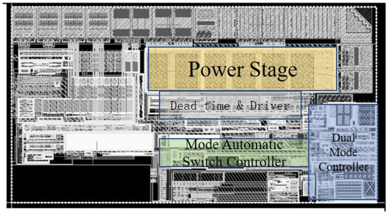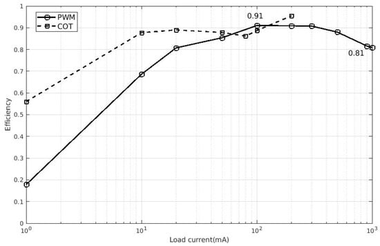 The converter designed in this paper uses 28 nm CMOS process to complete the layout. The chip area is 0.378 mm2, as shown in Figure 16. The simulation verification work is based on the Cadence platform and the Spectre tool. The results show that the chip can start normally at a full load and at no load, the starting process is smooth, the working state is stable after starting, and the automatic mode-switching process is smooth. The simulation results show that the input voltage of the converter is 3.3 V, and the output voltage is 1.05 V. The maximum load current can reach 1 A, and conversion efficiency can reach 81% at a full load, as shown in Figure 17. The peak conversion efficiency is 91% at 100 mA. The specifications of the converter are shown in Table 1.