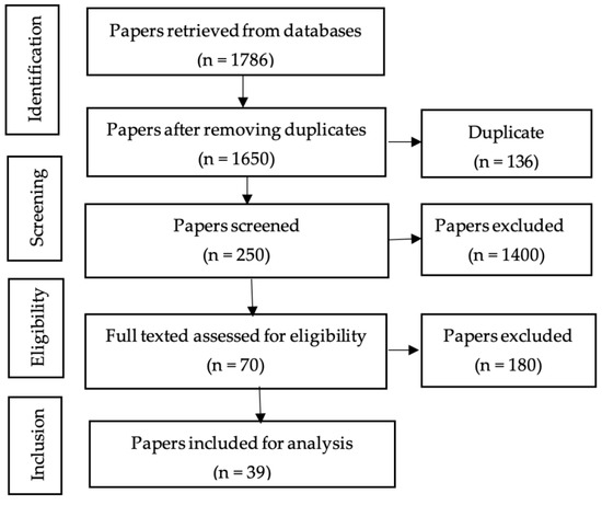 As shown in Figure 1, 39 articles from 1786 are included in this study. The reduction occurred due to a rigorous screening and selection process based on specific inclusion and exclusion criteria. Initially, 136 duplicate papers were removed, resulting in 1650 unique papers. These papers were then subjected to a thorough review, excluding 1400 papers that were deemed irrelevant or did not meet the criteria. The remaining 250 papers were further screened, excluding 180 papers that lacked methodological rigour or relevance to the research objectives. Finally, the remaining 70 papers underwent a comprehensive analysis, including 39 papers that provided substantial insights into the factors influencing blockchain adoption.