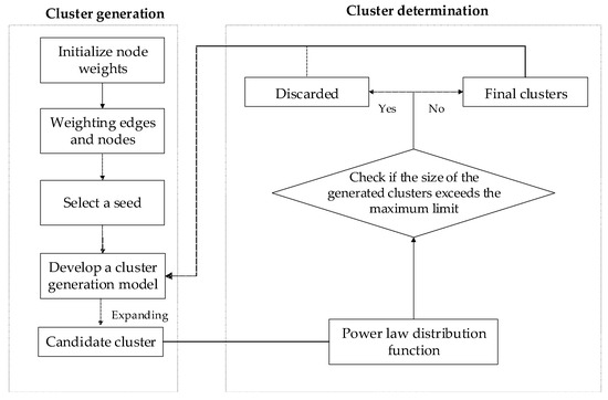 Let the cluster CS(v)’s size be denoted as |V(CS(v))| and be a parameter that refers to the allowable difference or deviation in the size of a cluster. Following that, we can find a value with in , assuming that clusters of size have been generated at the current stage. We calculated the maximum number of clusters corresponding to a given cluster size according to the power-law distribution function. If , the candidate cluster CS(v) is considered a final cluster. Otherwise, CS(v) is discarded.