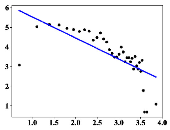In the clustering result of the BioGRID dataset, we took the logarithm of the cluster size x and the corresponding cluster number y, resulting in transformed variables and . To explore whether there is a linear relationship between and , a linear fitting method was performed on and . The results of the linear fitting analysis conducted on and is shown in Figure 3, providing valuable insights into the nature of their relationship.