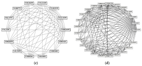 In this subsection, four predicted protein complexes with different sizes detected by the GCAPL algorithm are exhibited, and their corresponding network topology structures are shown in Figure 6. The predicted complex in Figure 6a is a fully interconnected network. Figure 6b shows a cluster that has a dense sub-graph with a relatively sparse periphery. Figure 6c,d show two clusters that are dense sub-graphs. Table 4 presents the Gene Ontology annotations of these predicted protein complexes in three aspects of biological processes, molecular functions, and cell components with corresponding significance p-values. The obtained p-values are notably small, indicating that these clusters have significant biological significance. The effectiveness of the GCAPL algorithm is demonstrated in its ability to identify protein complexes with multiple network structures.