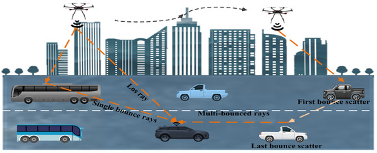 Due to their advantages of flexible deployment, strong adaptability, and wide coverage, UAVs are considered in emergency communication [7]. UAVs, as base stations, can increase the service ranges of cellular networks and provide high-quality communications [8,9]. They can not only resolve the limitations of facilities construction caused by terrain, climate, and natural disasters, but also effectively guarantee the popularization of emergency communication services [10,11,12]. Meanwhile, they can further improve the capacity and level of emergency communication and make the communication services more stable. As a typical application scenario, UAV-assisted urban transportation emergency communication has attracted increasing attention. For instance, traffic congestion impedes signal transmission, leading to difficulties in normal data transmission. Additionally, during urban transportation communication, the buildings and vehicles around the cars may interfere with vehicle-to-vehicle (V2V) communication. Therefore, it is meaningful to develop UAV-assisted emergency communication in urban transportation. To better design the future UAV-assisted emergency communication system, an accurate UAV-assisted multi-mobility channel model that can describe the real propagation characteristics is essential.