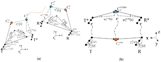 Figure 2a depicts the MB path within the model. To simplify the description of the model, only the nth (n = 1, …, (t)) cluster is illustrated in detail, in which (t) is the total cluster number between the Tx and Rx at the time instant t. In the nth cluster, denotes the first bounce cluster, and denotes the last bounce cluster. and constitute their respective positions after undergoing a shift for a given period. The propagation path between and is abstracted as a virtual link with a given delay. has a velocity of (t) and has a velocity of (t). The initial velocity of Tx is (0), while the acceleration of Tx is (t). Symmetrically, the initial velocity of Rx is (0) and the acceleration of Rx is (t). Additionally, (t) and (t) refer to the unit vectors that extend from Tx to and Rx to , respectively.