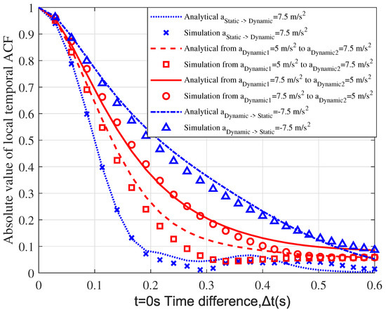 Figure 5 illustrates the temporal ACFs of the U2V channel model under different moving accelerations of clusters around the Rx. Here, different motion states of the clusters are considered, including static to dynamic, dynamic to static, and dynamic to dynamic. Moreover, the state of dynamic to dynamic contains both increased acceleration and decreased acceleration. In the simulation, we can observe that within a time difference, the analytical results match well with the simulation results, showing the validity of the proposed model under different motion states. In addition, the temporal ACFs present different variation trends under different states, which show that the changes in acceleration will have an influence on the temporal ACFs. During the given time difference, when the cluster moves from a static to a dynamic state with a fixed acceleration 7.5 m/s, the temporal ACF declines the fastest. Meanwhile, when the cluster moves from a dynamic to a static state with a fixed acceleration −7.5 m/s, the temporal ACF falls the slowest. In the case of variable acceleration, the temporal ACF with increased acceleration declines faster than that with decreased acceleration. From the figure, it can be seen that the channel changes faster with the increase in acceleration, which brings a smaller coherence time. The temporal ACFs present a slower variation trend with decreased acceleration. Hence, the moving velocity and motion state of the vehicles around the Rx will have an influence on the temporal ACFs.