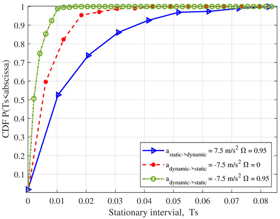 Figure 6 illustrates the cumulative distribution functions (CDFs) of the stationary interval for clusters with different acceleration. The joint effects of different dynamic–static ratios and accelerations of clusters on the stationary intervals are investigated. From Figure 6, it can be observed that a decreased will lead to a larger stationary interval when all other conditions are kept consistent. denotes the ratio of the cluster number from the dynamic state to static state. With a decreasing ratio, the number of vehicles around the Rx becomes much smaller, and the channel tends to be stable. Moreover, under the same conditions, the stationary interval of the channel in vehicle deceleration motion is larger than that of the acceleration motion case. Hence, the dynamic–static states and the acceleration of clusters around the Rx have some effects on the stationary interval.