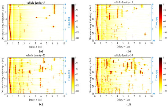 The is a time-variant function influenced by the time-variant delays of the rays within clusters. These delays correspond to updates in geometric information within the propagation space. It should be noted that only surviving clusters contribute to the PDP [40]. The change in PDP is a result of the evolution of clusters, which is dependent on the vehicle’s speed and trajectory. Therefore, different trajectories and velocities will result in distinct PDP trends.