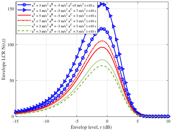Figure 8 illustrates the impact on the LCR with different accelerations of the Tx, Rx, and cluster. The initial velocity of the cluster is set as 3 m/s. The initial velocity of the Rx () is set as 1 m/s. The initial velocity of the Tx () is set as 5 m/s. The vehicles move straight while the UAV remains on a circular trajectory. The time is set as t = 1 s. The results show that the peak value of the LCR increases as , , and increase. The channel changes faster over time as the acceleration increases, and the stationarity of the channel decreases. Notably, the impact of the rising on the LCR is more significant than that of or at the same envelope level, which is consistent with reality.