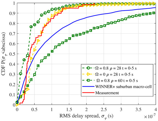 In Figure 9, the CDFs of the RMS delay spread utilizing the corresponding measured data and WINNER+ suburban macro-cell scenario for reference are provided. By setting the same parameters as in the real measurement, the CDFs of the delay spread in the case of = 0 and = 28 match well with the measurement data, which shows that the introduction of and ρ makes the channel model more practical.