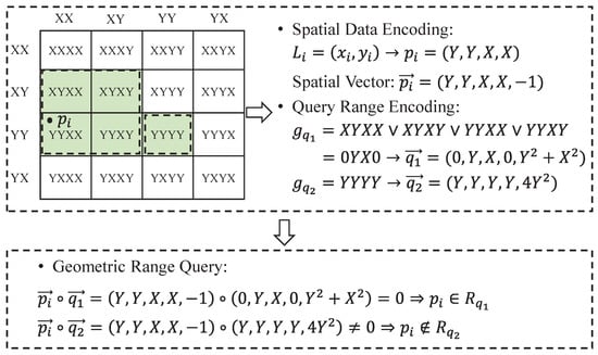 As shown in Figure 2, we give an example of the encoding procedure and geometric range query. In Figure 2, the spatial space is uniformly split into cells. The spatial point is encoded as and further extended as spatial vector . In addition, the geometric query range (green domain) is encoded as and . After that, the corresponding query vectors are further extended as and , respectively. Therefore, the inner product between and is 0, which means that the spatial point is located in the geometric query range .