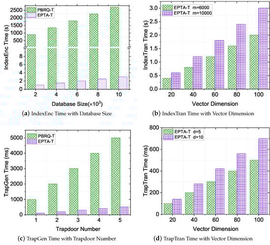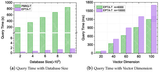 Performance evaluation of IndexEnc and IndexTran. The cost of IndexEnc was dominated by the database size m. As shown in Figure 3a, when the database size was 10,000, the index encryption time of EPTA-T was about 3 s, while that of PBRQ-T was more than 2500 s. The reason is that our EPTA-T scheme only executes randomizable matrix multiplication for data privacy protection, while PBRQ-T conducts bilinear mapping and exponentiation operations, which have a more-expensive computational cost than our scheme. Therefore, with the increase of the database’s size, EPTA-T can save more computational costs on the worker side. Since PBRQ-T does not involve the index transformation operation, we only evaluated our EPTA-T on IndexTran with varying vector dimensions (i.e., n). As shown in Figure 3b, we noticed that our proposed EPTA-T increased linearly with the variable vector dimension n. In addition, the IndexTran costs over different database sizes m were almost close in the lower-dimensional setting.