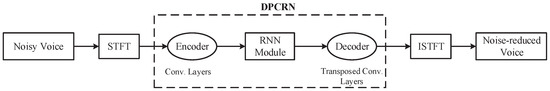We feed the noisy voice signals into the DPCRN and send its real and imaginary parts to the encoder as two data streams. The encoder employs a two-dimensional convolutional layer to extract the voice features from the noise spectrogram and compress the feature resolution. The decoder is symmetric with respect to the encoder and uses the transposed convolutional layers to restore the low-resolution features to their original size. The DPCRN outputs a CRM in the last transposed convolutional layer by learning the voice features and using the signal approximation algorithm. Finally, the noise is removed by CRM and the time-domain noise-reduced voice signals can be obtained by an ISTFT.