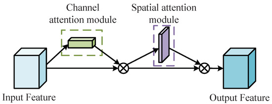 The core of the CBAM module is to focus on the key features and ignore the irrelevant features. As an attention module applied to feedforward neural networks, the CBAM module serially incorporates a channel attention module (CAM) and a spatial attention module (SAM) to perform the feature extraction in two independent dimensions for the adaptive feature optimization. The CBAM module is a lightweight attention module that can be easily integrated into the DRSN architecture, while reducing the use of large numbers of parameters and the complexity of the model. It was discussed in [26] how the CBAM was able to improve the feature extraction without increasing the complexity, outperforming the traditional SE attention module with a 22.66% error in ImageNet-1K classification experiments [27]. The structure of the CBAM module is shown in Figure 5.