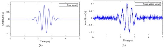 Figure 6 illustrates the echo signal simulation generated using a Gaussian model. The time-domain graph of the pure ultrasonic echo signal is displayed in Figure 6a, while the time-domain graph of the noisy signal with an SNR ratio of 9 dB is shown in Figure 6b.